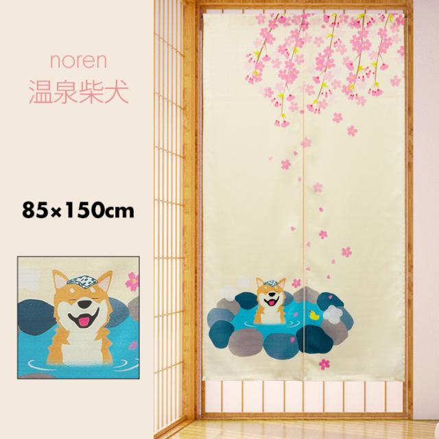 のれん 暖簾 おしゃれ カーテン 間仕切り 仕切りカーテン 目隠し 柴犬 日本犬 和風 和柄 日本 桜 露天風呂 柴犬と温泉 85×150cm