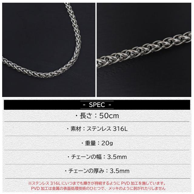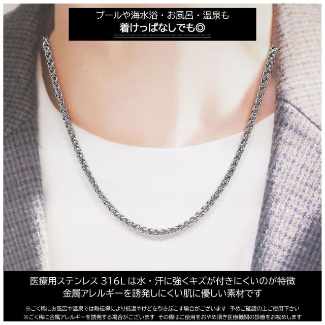 スクリューチェーンをダブルで編み込むことで重厚感がプラス。水・汗に強いステンレス316Lは、装着したままでも海やプール、温泉などにも入水できます。キズが付きにくいので、お手入れなしでもいつまでも輝きが持続します。金属アレルギーを誘発しにくい肌に優しい素材です。