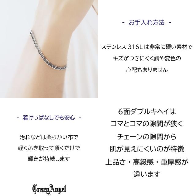 ステンレス素材では流通が少ない6面Wキヘイは、コマとコマの隙間が狭いので、チェーンの隙間から肌が見えにくく、上品さ・高級感が全然違います。