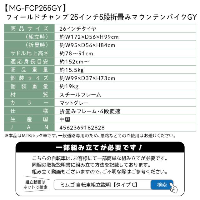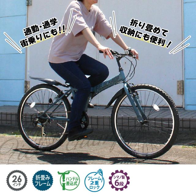 ミムゴ 自転車 折り畳み 折りたたみ マウンテンバイク FIELD CHAMP フィールドチャンプ 26インチ 6段変速ギア MG-FCP266GY コンパクト 通勤 通学 お出かけ メーカー直送