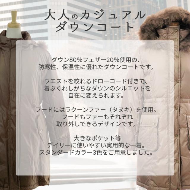 柔らかな立ち襟が首を優しく包んでくれ、フードには毛足が長くふわふわのラクーンファー。