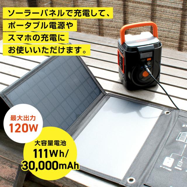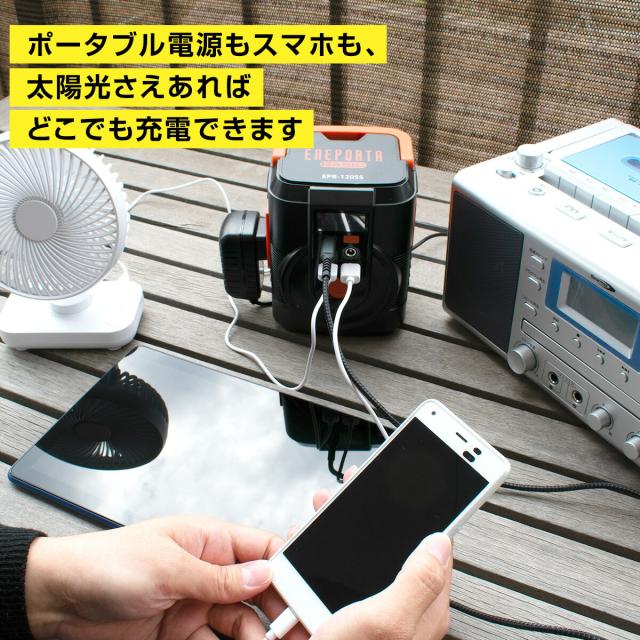 ソーラーパネルで充電して、ポータブル電源やスマホの充電にお使いいただけます。