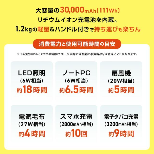 大容量の30,000mAh(111Wh)リチウムイオン充電池を内蔵。