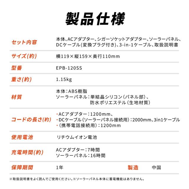 | コードの長さ(約) | ・ACアダプター:1200mm、 ・DCケーブル(ソーラーパネル接続用):2000mm、3in1ケーブル ・(携帯電話接続用):1200mm |