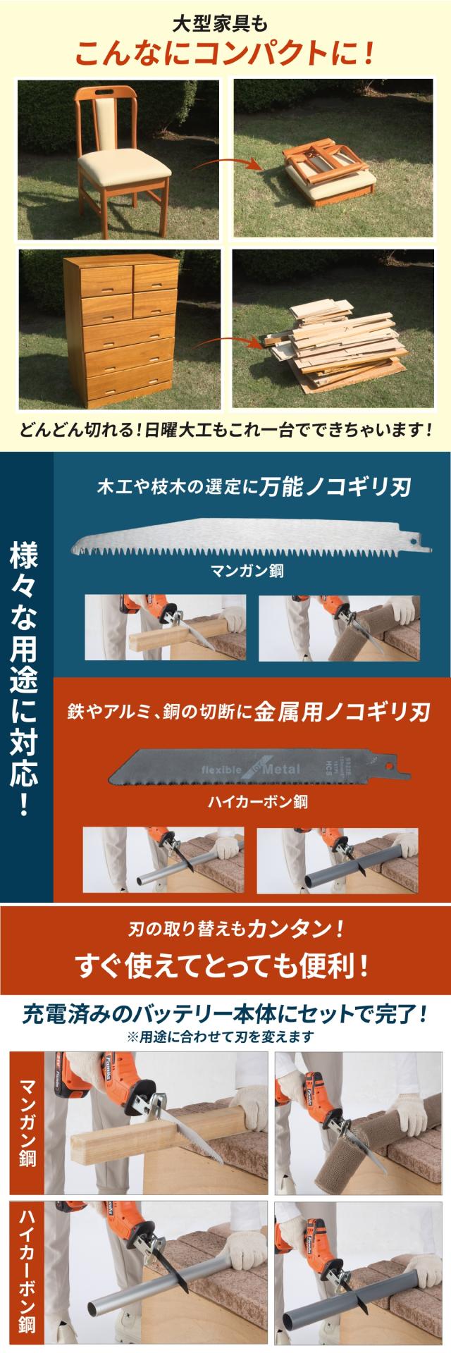 | 付属品 | 本体、木材、ジュータン用ノコ刃(替え刃2枚)、金属、プラスチック用ノコ刃(替え刃2枚)、ACアダプター、バッテリー、収納ケース |