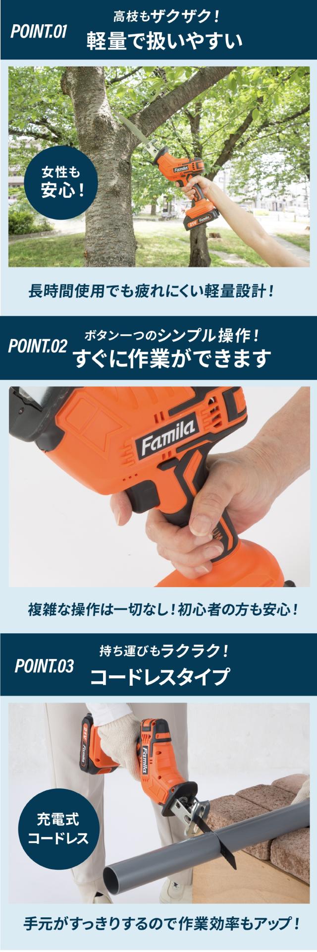 電動ノコギリ のこぎり 充電式 6点セット ファミラ チェーンソー 電動チェーンソー コードレス 電動のこぎり 家庭用 強力 片手 木工切断 軽量ポータブル伐採 ポータブル 収納ケース付き 枝切り 庭木 軽量 園芸