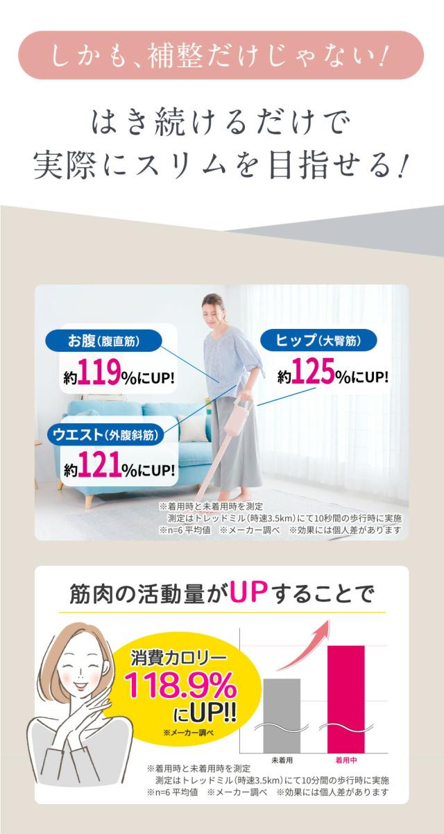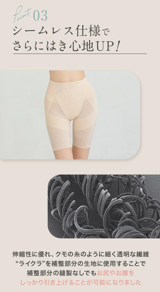 伸縮性に優れ、クモの糸のように細かく透明な繊維”ライラク”を補正部分の生地に使用することで補正部分の縫製なしでもお知りやお腹をしっかり引き上げることが可能になりました
