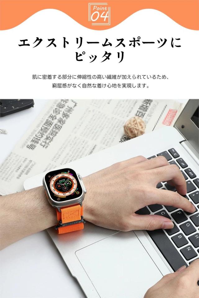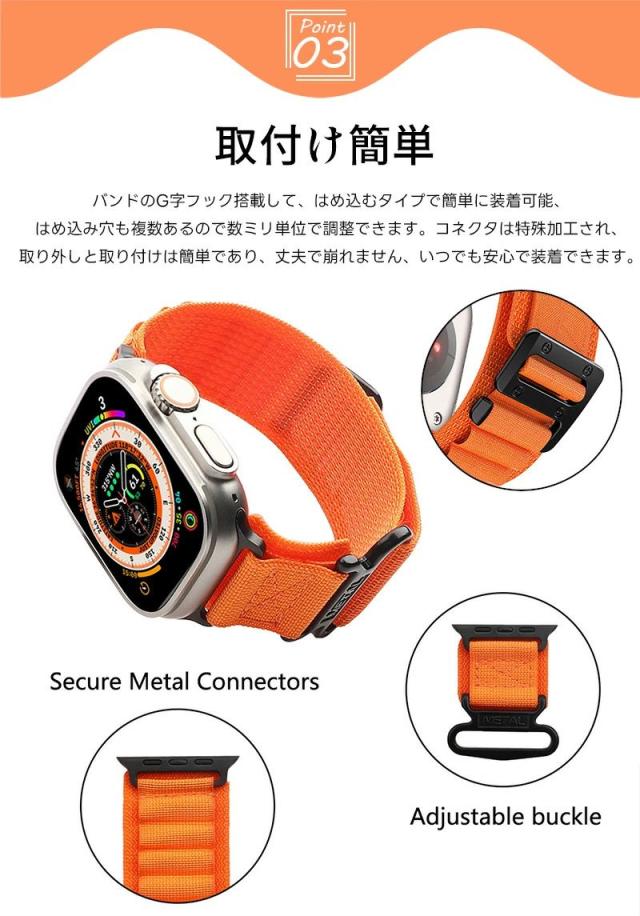 このApple watch Ultra バンドは耐食性のあるチタニウムで作られたG字フックを簡単に通してしっかり装着できます。Apple Watchをしっかり装着でき、サイズの調節も簡単にできます。
