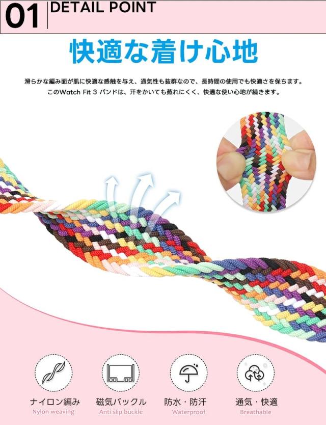 Watch Fit 3 バンドは、伸縮性に優れた高品質ナイロン素材で作られており、軽量で柔らかく、肌に優しい着け心地を提供します。滑らかな編み面が肌に快適な感触を与え、通気性も抜群なので、長時間の使用でも快適さを保ちます。このWatch Fit 3 バンドは、汗をかいても蒸れにくく、快適な使い心地が続きます。