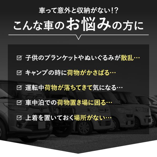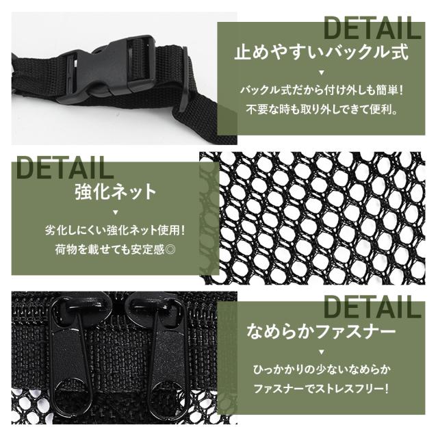 - 全体的に値段の割に厚めの素材が高級感と安心感があり 再度に全幅分のチャックが付いて網が二重で 上と真ん中に収納 更に下部真ん中に一回り小さいチャック付きのネットポケット付いてこれは車中泊に大変良いです お得感満載でした♪