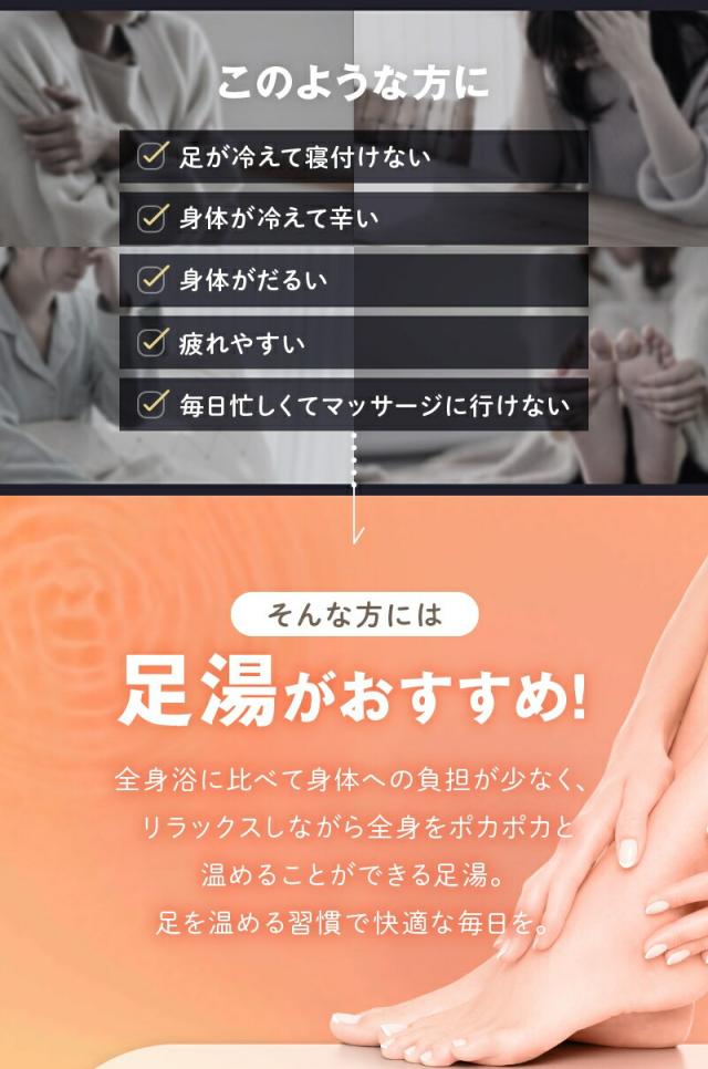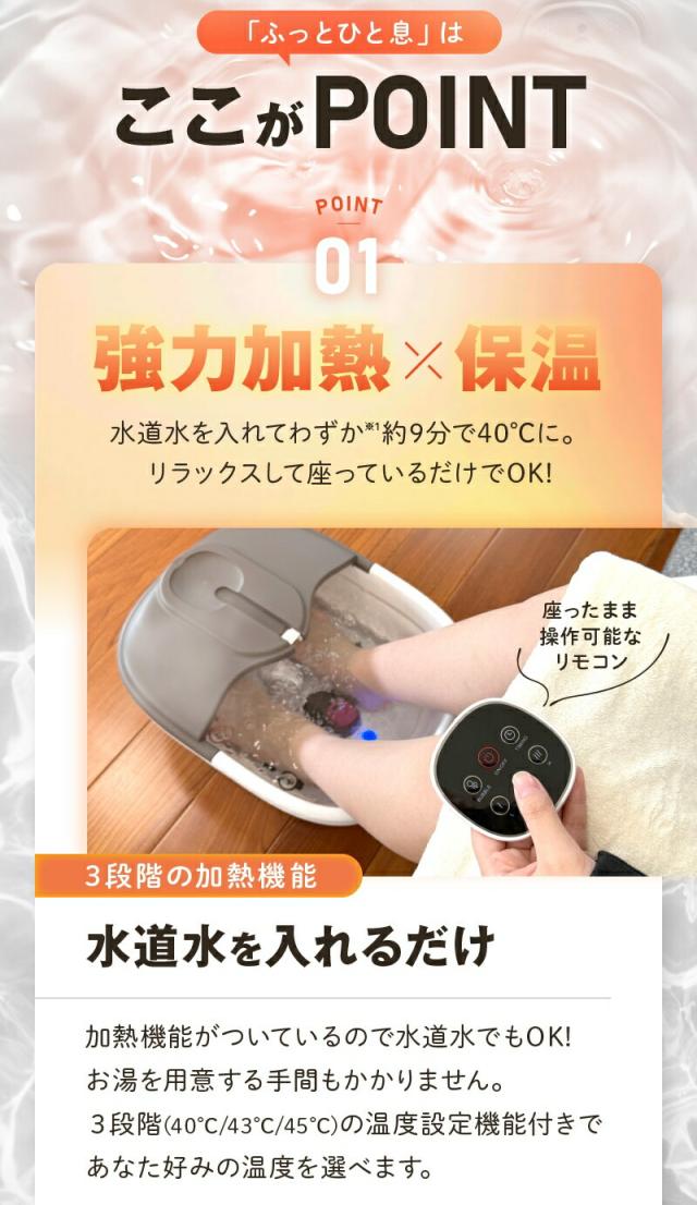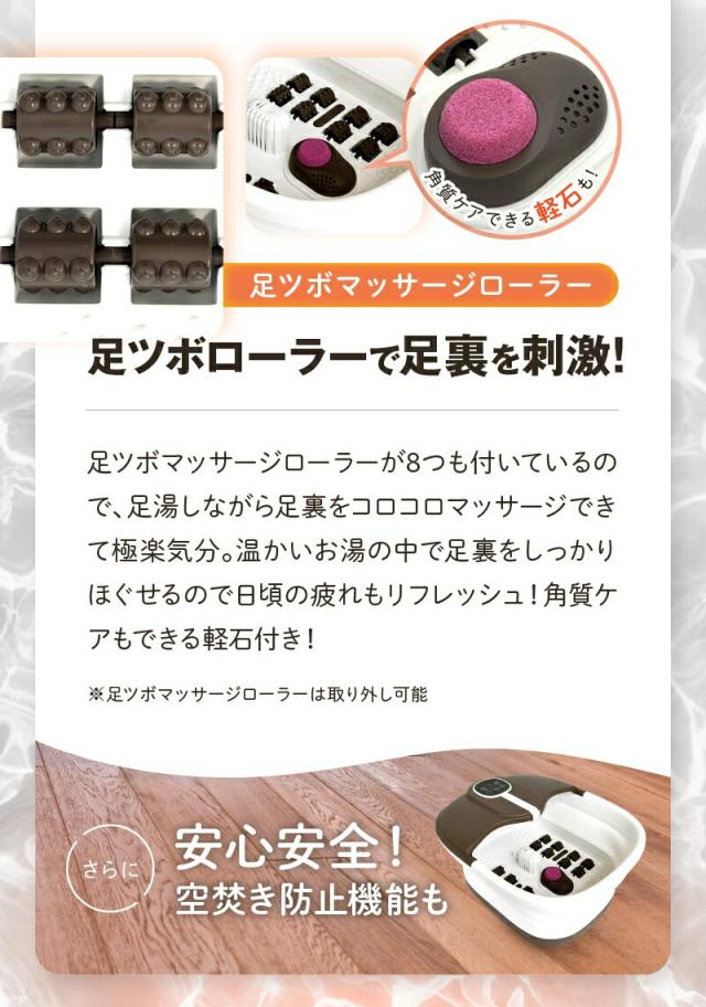 | 機能 | 加熱・3段階温度調節(40℃・43℃・45℃)・保温(20 分・60分)・バブル・軽石・マッサージローラー付き・リモコン 操作・空焚き防止・折りたたみ式 |