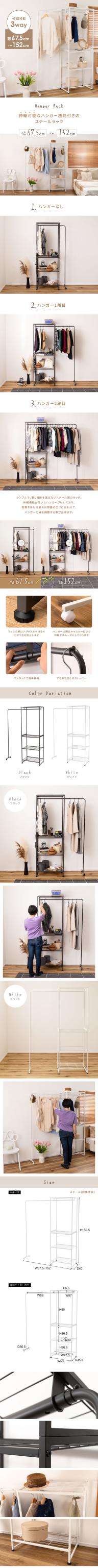●シンプルで、置く場所を選ばないスチール製のラック。伸縮機能が付いたハンガーが付いており、衣類を掛ける量やお部屋の広さに合わせて、ハンガーの幅を調整する事が出来ます。