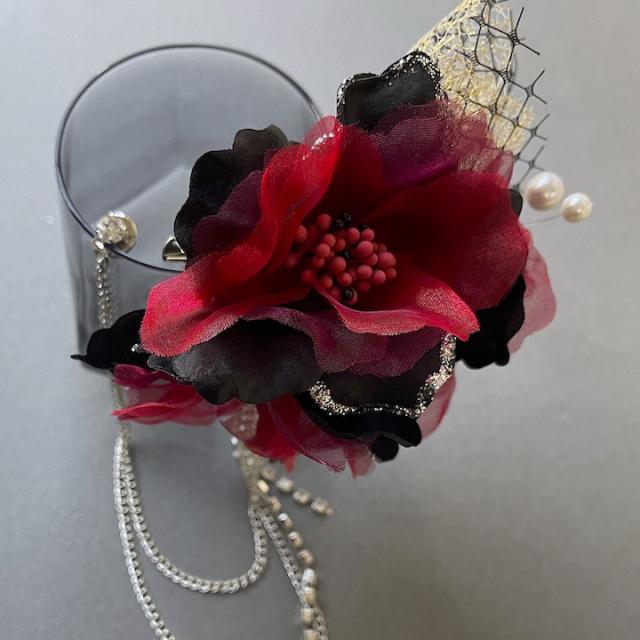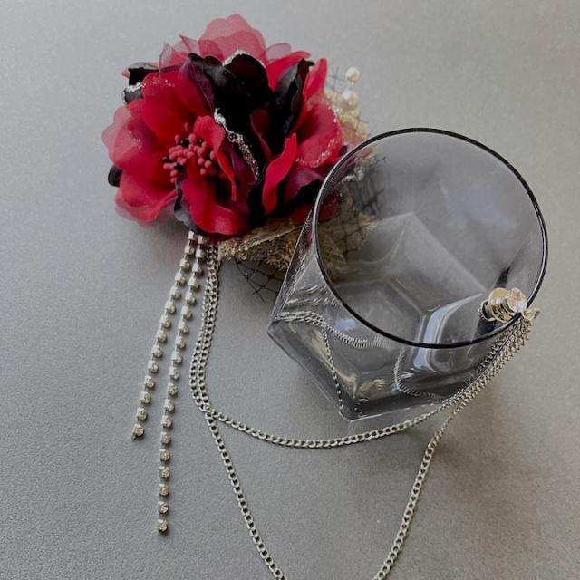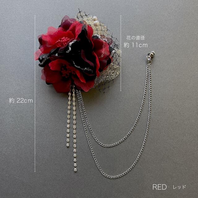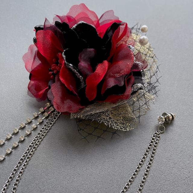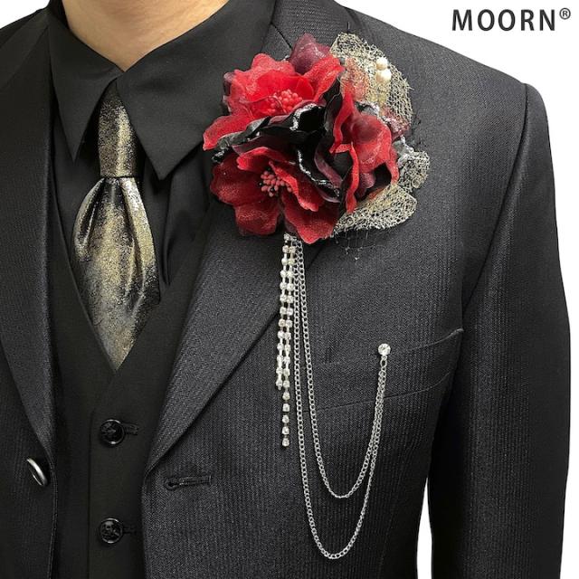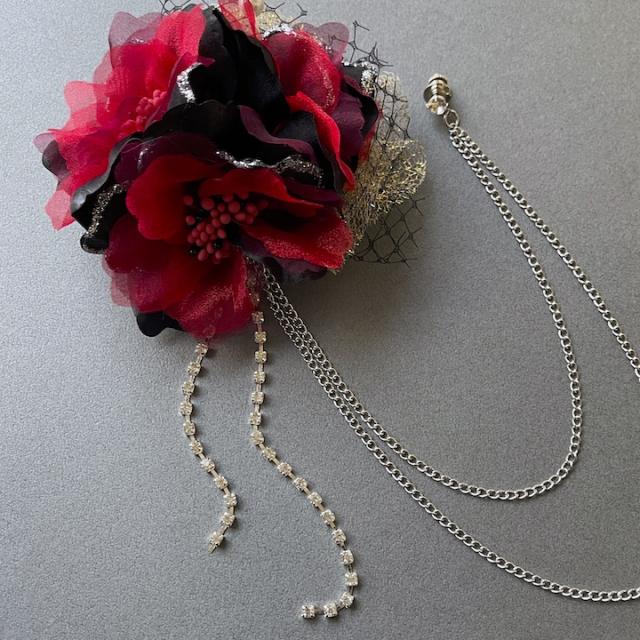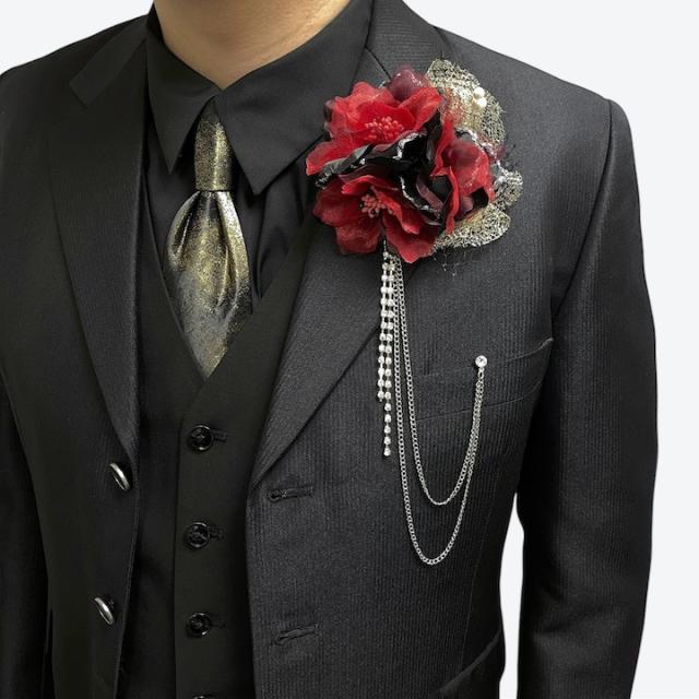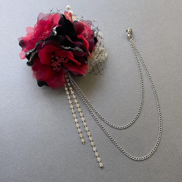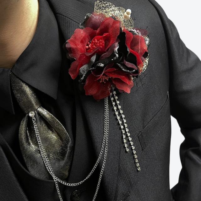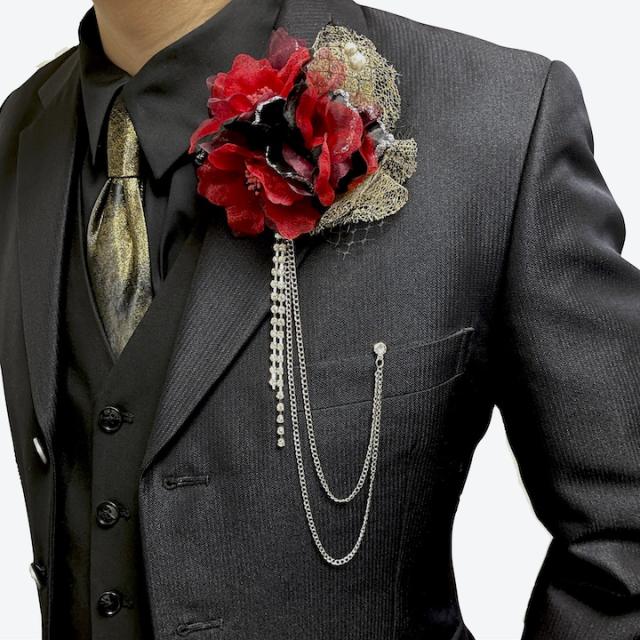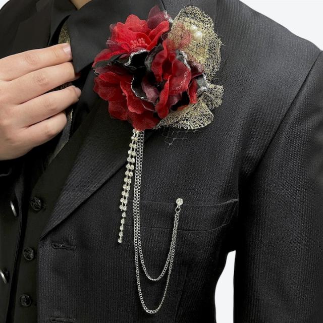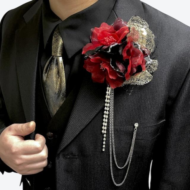 コサージュ 赤 メンズ 男性用 レッド ストーン チェーン コサージュ ブローチ 結婚式 披露宴 フォーマル スーツ タキシード 男 メンズ アクセサリー 花 ブライダル 発表会 ハロウィン クリスマス パーティー 司会 進行役 衣装 衣裳