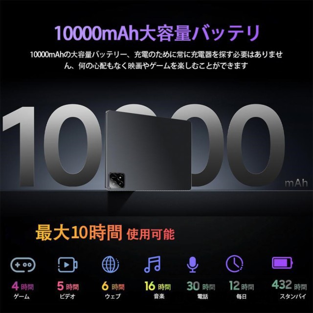 10.1インチ Wi-fiモデル タブレット 最新Android14/15搭載タブレット 超軽量で薄く使い勝手が良く、仕事・勉強・出張など、持ち運びにも最適です。 OS:Android14/15 製品サイズ :248mm*155mm*6.9mm 液晶サイズ:10.1 インチ 解像度:2560*1600 CPU:MT6750 RAM :4GB/8GB/12GB ROM:64GB/128GB/256GB/ バッテリ容量:10000mAh カメラ:フロント(1600万画素) リア(3200万画素) RAM/ROM容量:RAM 6GB/ROM 128GB (microSDカード別売、最大128GBが追加可) 無線:IEEE 802.11 ac/a/b/g/n 2.4GHz/5GHz Bluetooth:Bluetooth5.0 GPS:衛星 GPS対応 SIMサイズ:nanoSIMカード(一部キャリア対応不可) 言語:日本語含めマルチ言語【新品特典】注文プレゼント ★期間限定贈呈豪華6点セット 該当商品はYouTube、U-NEXT、Amazonプライム、Netflix等の視聴アプリは問題なく可動します。 10.1インチ Wi-fiモデル タブレット
