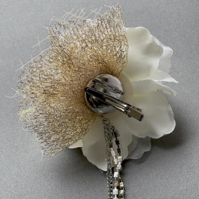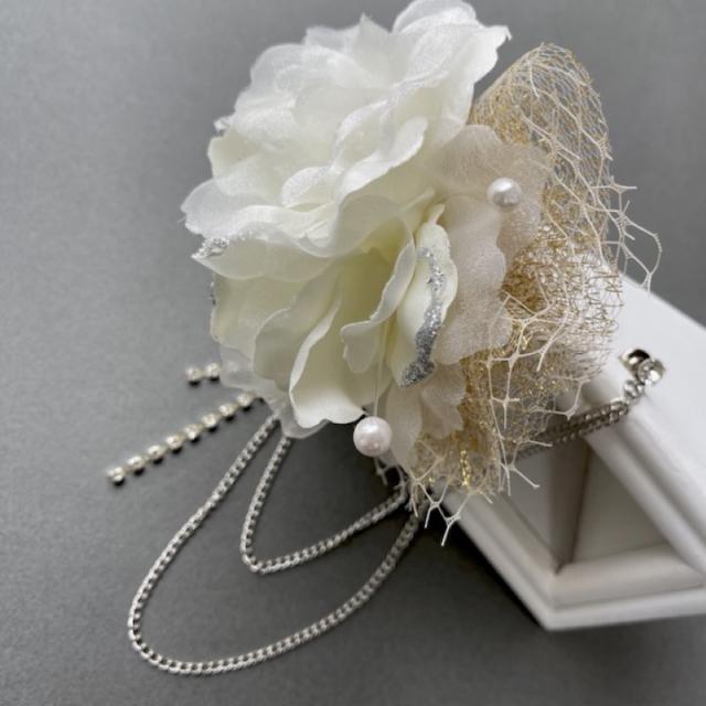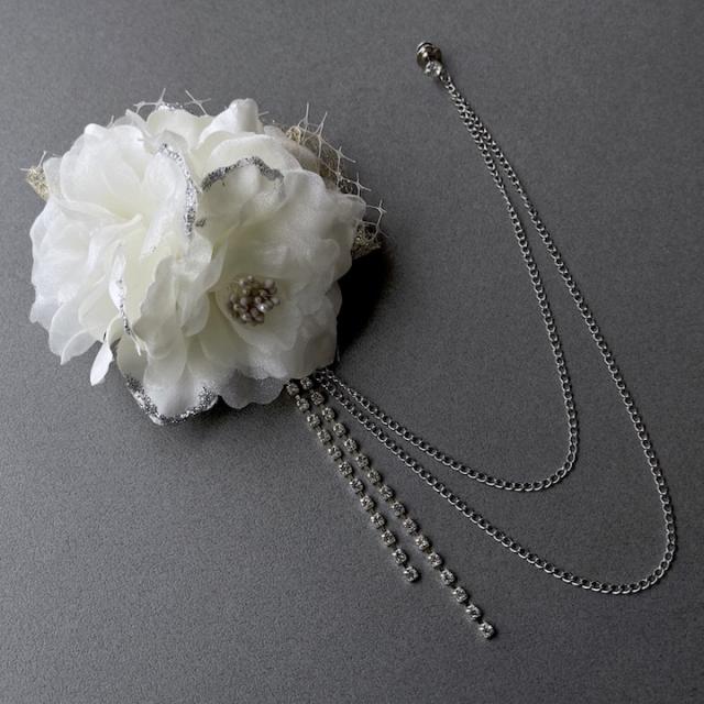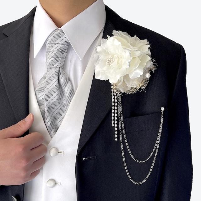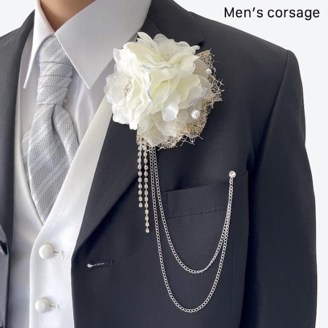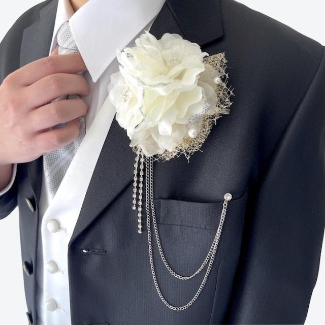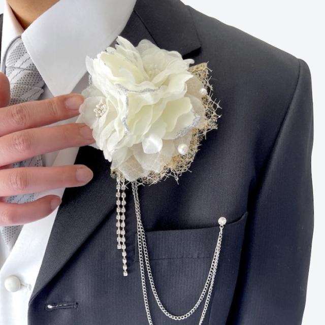 コサージュ 男性用 白 ホワイト メンズ ストーン チェーン コサージュ ブローチ ラペルピン 結婚式 ゲスト 披露宴 フォーマル スーツ タキシード 男 メンズ アクセサリー 男性用 花 高級感 ブライダル ホスト パーティー 新郎 司会 衣装 衣裳