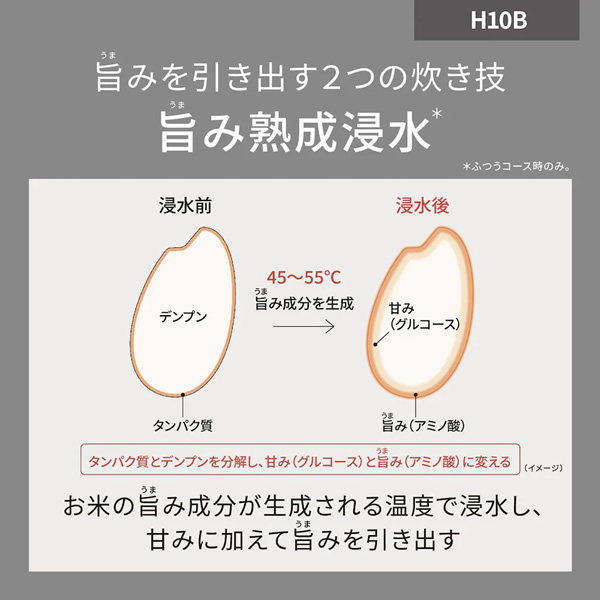 お米の旨み成分が生成される温度で浸水し、甘みに加えて旨みを引き出す。