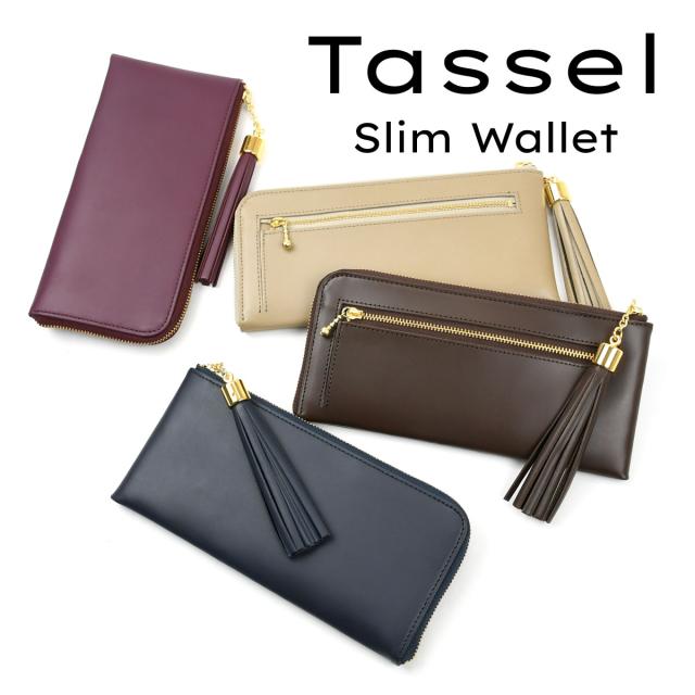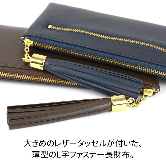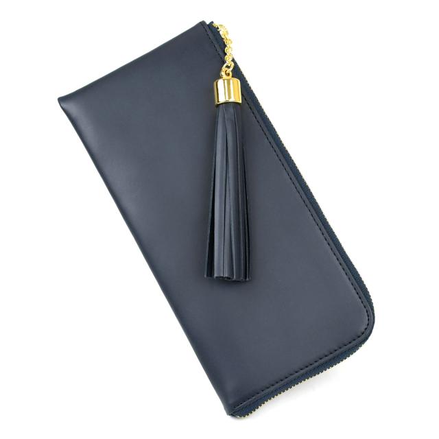 タッセルウォレット スムースレザー NAVY 日本製 長財布 L字ファスナー 外ポケット付き 外側 小銭入れ 本革 財布 レディース 革 レザー 薄い 薄型 使いやすい YKK 長サイフ ロングウォレット Tassel Wallet タッセル チャーム 送料無料 NNW02 紺色