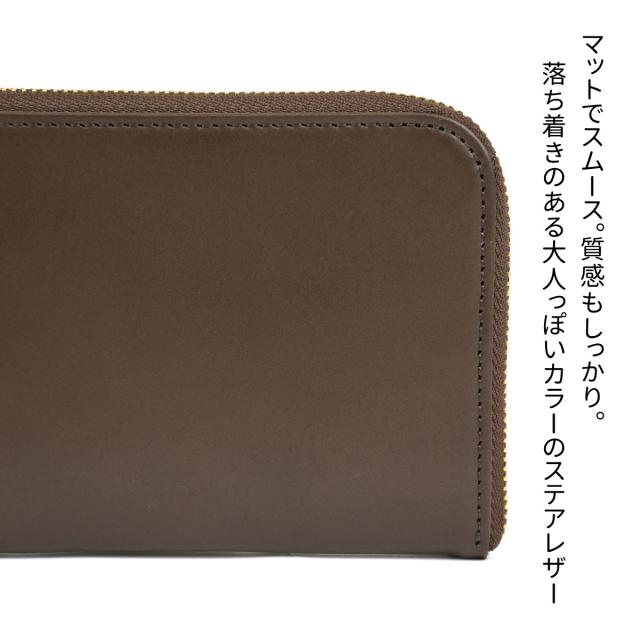 兵庫県姫路市のタンナーでつくられた、マットなスムースレザーを使用。原皮が北米産のステアレザーなので、しっかりとした質感。シンプルかつ、高級感のある仕上がりになっています。