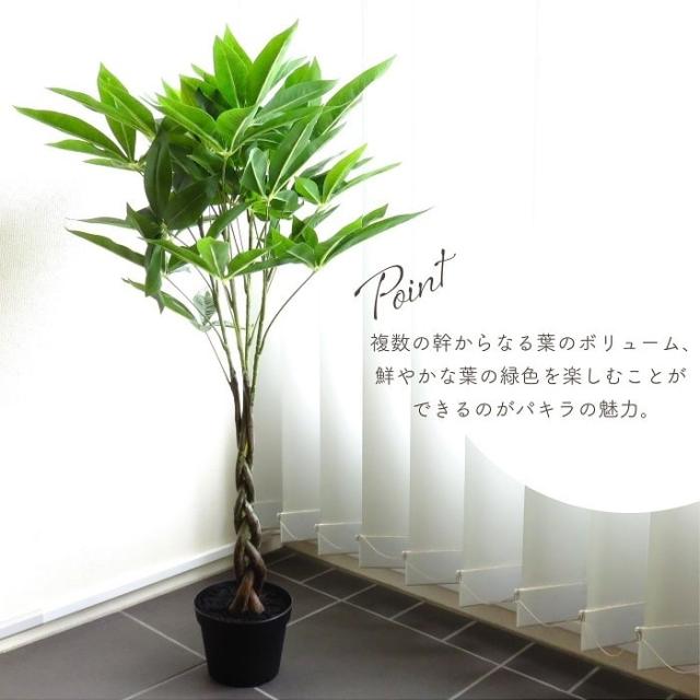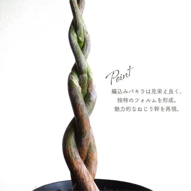 ボリュームもあり編込みパキラは見栄え良く、独特のフォルムを形成した魅力的なねじり幹を再現。 “発財樹(Money tree)”という別の呼び名があり、縁起の良い、運気の上がる木とされ日本でもっともポピュラーな観葉植物のひとつでもあります。リアルな質感を再現したアーティフィシャルグリーンです。