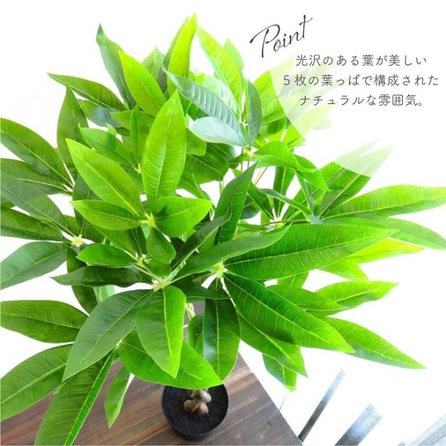 複数の幹からなる5枚の葉が大きく,光沢のある鮮やかな葉の緑色を楽しむことができるのがパキラの魅力。