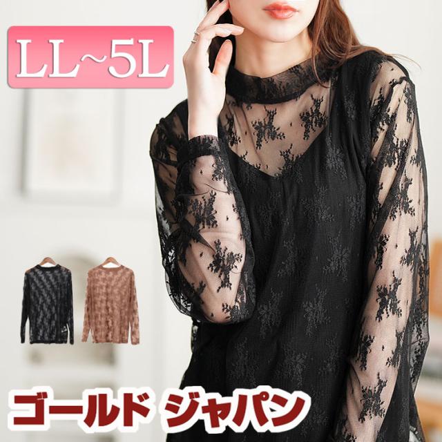 春新作 大きいサイズ レディース トップス カットソー ミニハイネック花柄チュールレーストップス 長袖 シアー 透け感 チュール レース 花レース ミニハイネック 花柄 フラワー ストレッチ レイヤード ゆったり 春服 秋服 LL 2L 3L 4L 5L ブラック 黒 モカ ゴールドジャパン