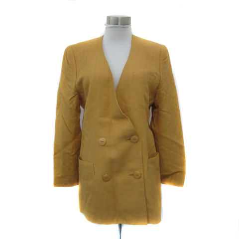 【中古】レリアン Leilian ノーカラージャケット ミドル丈 ダブルボタン 無地 麻 リネン混 9 オレンジ レディース