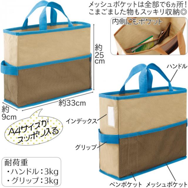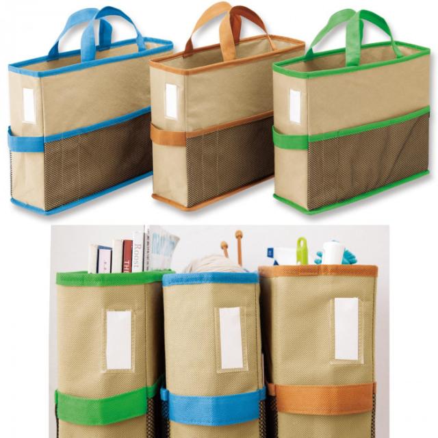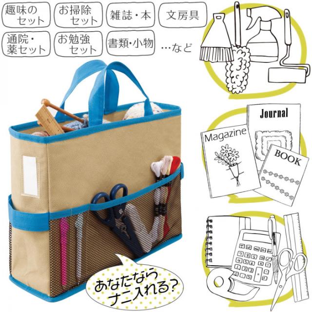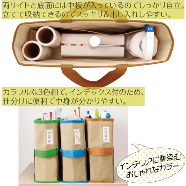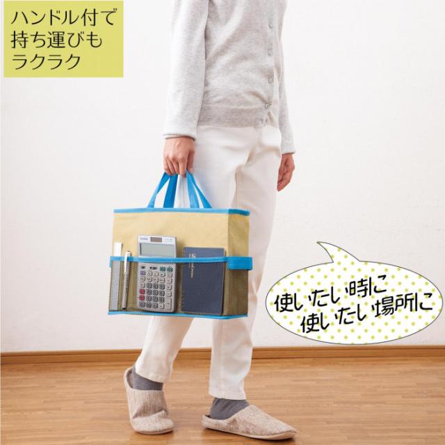 ハンドル付で持ち運べる収納ボックスです。趣味のセットやお掃除のセット、雑誌・本、書類・小物、通院・お薬セット等ひとまとめに収納できます。3色セットなので色で区分しやすく、インデックスで中身がすぐ分かる!ハンドル付で持ち運びもラクラク♪使いたい時に使いたい場所にサッと移動できます。メッシュポケットは全部で6ヵ所あり、こまごました物もスッキリ収納。A4サイズがスッポリ入ります。3色組。【お取り寄せ商品】3〜5営業日前後で発送予定