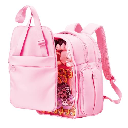 あなただけの推し活を応援する、推しごとバックパックです。 日常のお出かけの際にも街に溶け込み、会場付近までの移動中にも活躍する「擬態モード」と、ぬいぐるみやバッジをアピールできる「推し活モード」を切り替えられます。 普段は隠せる大きな透明窓で、大好きな推しをバッチリアピールできます。 面ファスナーでしっかり固定できる、着脱式のディスプレイ用仕切りが付属しています。 ディスプレイ用仕切りには、ストラップや缶バッジを取り付けやすい粗目のメッシュ生地を採用しています。 ディスプレイ用仕切りを折りたたんで固定することで、簡易2気室構造にすることができ、ぬいぐるみなど厚みのあるグッズの配置にも対応します。 ディスプレイ用仕切りを取り外すことで、メイン気室の空間全体を見せることが可能。自由に内部を装飾できます。 フロントパーツの着脱により、「擬態モード」と「推し活モード」を切り替えることができます。 取り外したフロントパーツにはショルダーベルトが付いているので、サコッシュとして使えます。