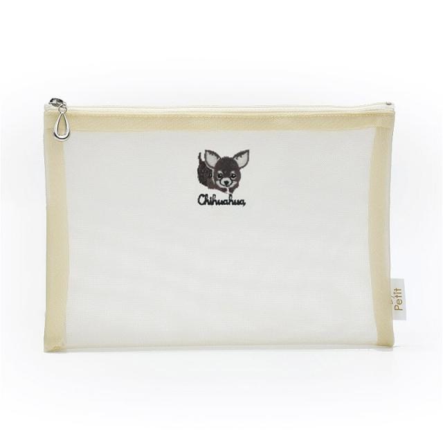 犬猫柄 刺繍 中身が見える【メッシュポーチ】チワワ 小物入れ フラットポーチ ペットグッズ