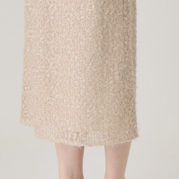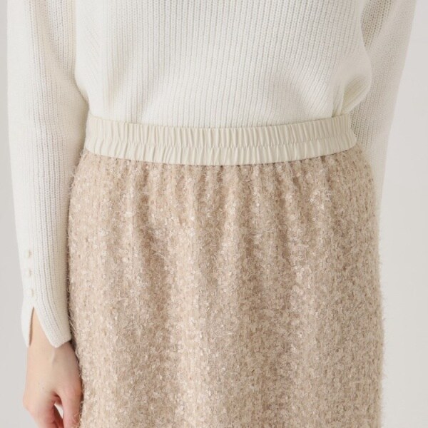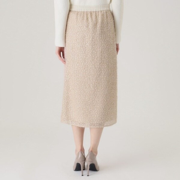 フェザーの様な意匠感とスパンコールが今らしい華やかさを印象づけるスカート。
