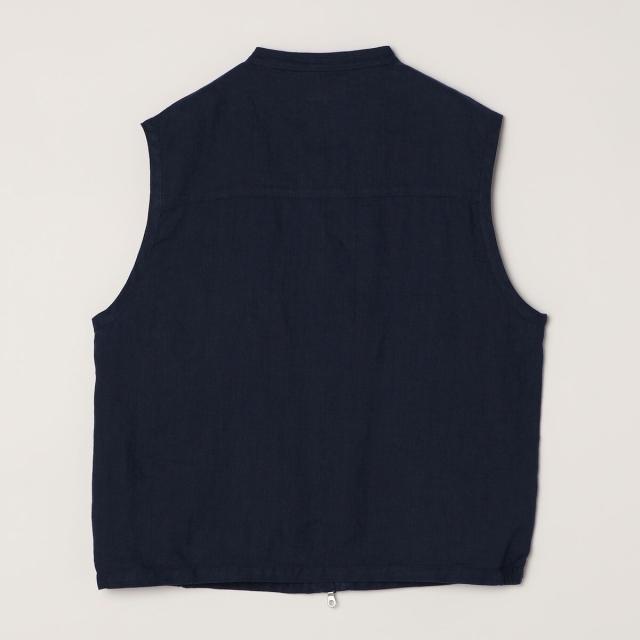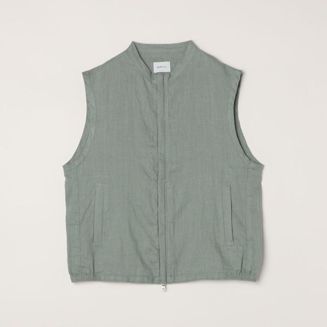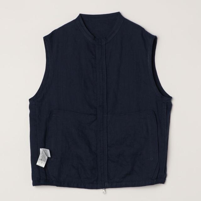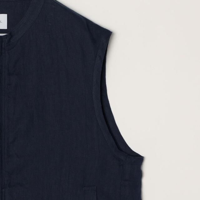 シンプルで上品に決まる、大人のバンドカラーリネンベスト