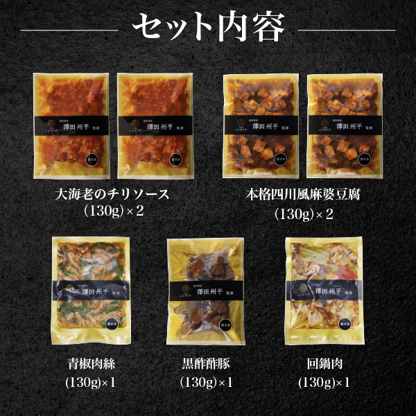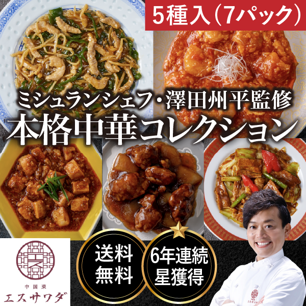 エスサワダ 総料理長・澤田州平監修 【全5種】 本格中華コレクション 人気商品満足セット 良品たいこばんオリジナル|大海老のチリソース×2 黒酢酢豚 本格四川風麻婆豆腐×2 青椒肉絲 回鍋肉 通販 簡単 ギフト 贈答用 湯煎 レンジ 【送料無料】 父の日 母の日 プレゼント