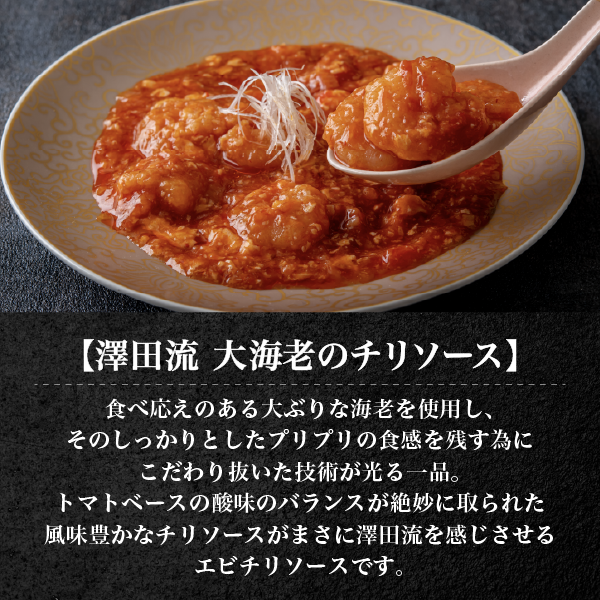 食べ応えのある大ぶりな海老を使用し、そのしっかりとしたプリプリの食感を残す為にこだわり抜いた技術が光る一品。トマトベースの酸味のバランスが絶妙に取られた風味豊かなチリソースがまさに澤田流を感じさせるエビチリソースです。