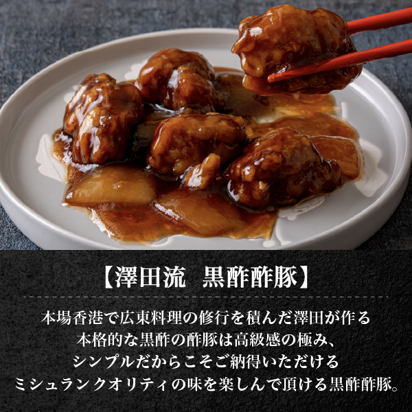 本場香港で広東料理の修行を積んだ澤田が作る本格的な黒酢の酢豚は高級感の極み、シンプルだからこそご納得いただけるミシュランクオリティの味を楽しんで頂ける黒酢酢豚。