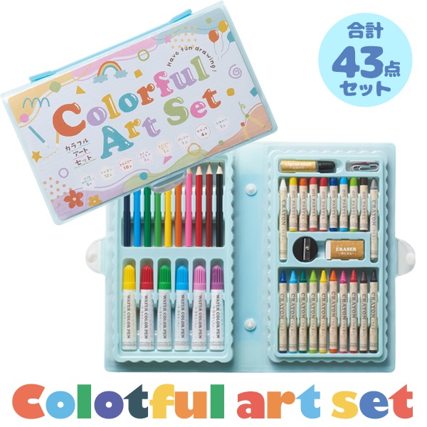 カラフルアートセット 豪華43点 色鉛筆 クレヨン 水性カラーペン オイルパステル のり 鉛筆削り クリップ 消しゴム 収納ケース付き ついで買い特集【 POP作成 おえかきセット お絵描き 画材 絵はがき ぬりえ 小学生 女の子 男の子 誕生日 】 /60N◇ カラフルアートセット
