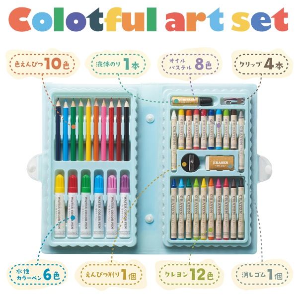 | セット内容 | 色鉛筆10色 液体のり 鉛筆削り クリップ4個 クレヨン12色 消しゴム 水性カラーペン6色 オイルパステル8色 |