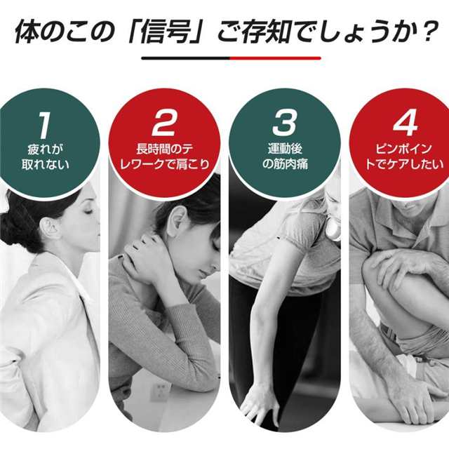 ・4種類マッサージヘッド:U型ヘッド、円柱型ヘッド、球型ヘッド、平型ヘッド。