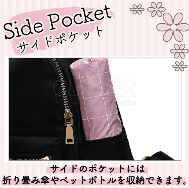 サイドポケットには折り畳み傘やペットボトルがスッキリ収納、サッと取り出せます。