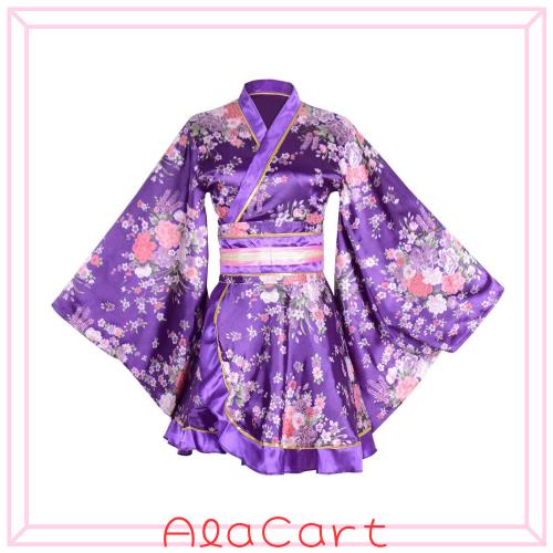 HONGFU レディース 花魁系 ロング 着物ドレス シフォン 桜 和風 浴衣 コスチューム コスプレ衣装 帯付き 紫