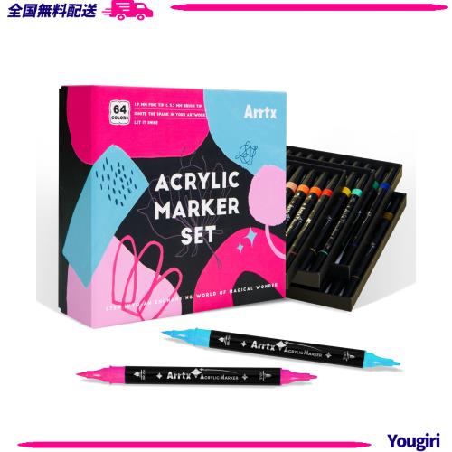 Arrtx アクリルペイントマーカー 64色 デュアルチップアクリルペイントペン 岩絵、木材、セラミック、布、ガラス、キャンバス、プラスチ