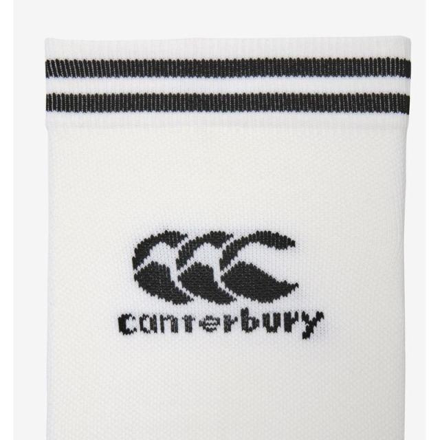 カンタベリーロゴを配したシンプルでクラシックなデザインのカーフソックス。