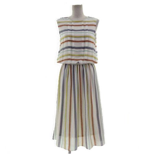 【中古】INTERPLANET ワンピース ノースリーブ ロング丈 ウエストゴム マルチボーダー ストライプ 白 マルチカラー 2