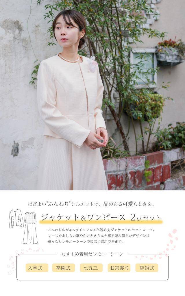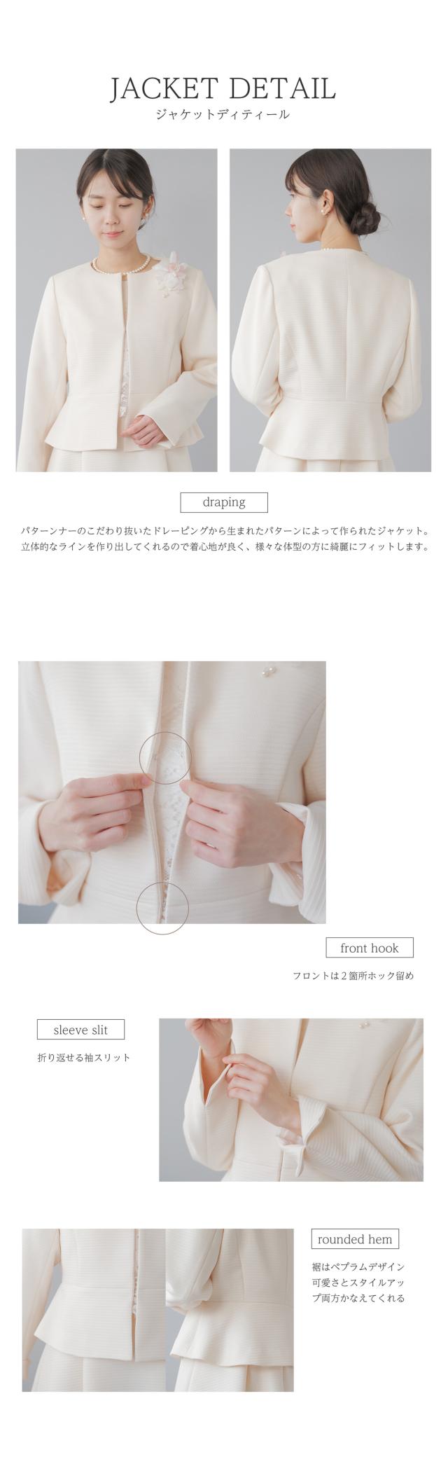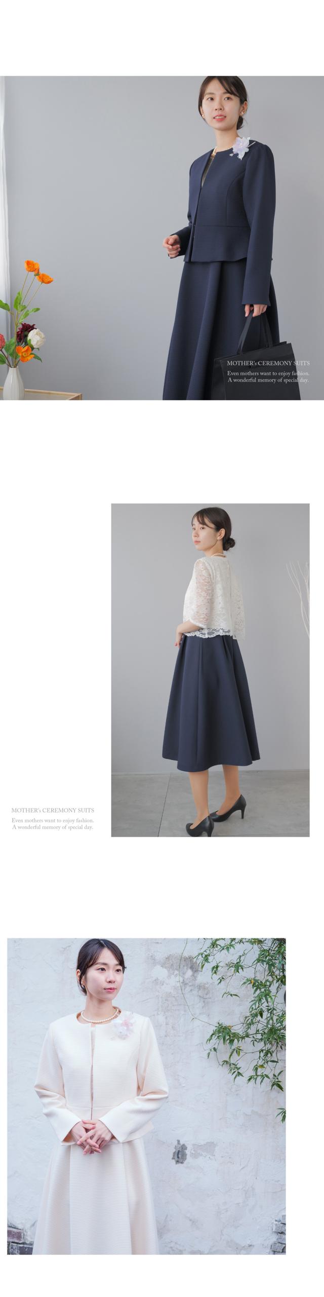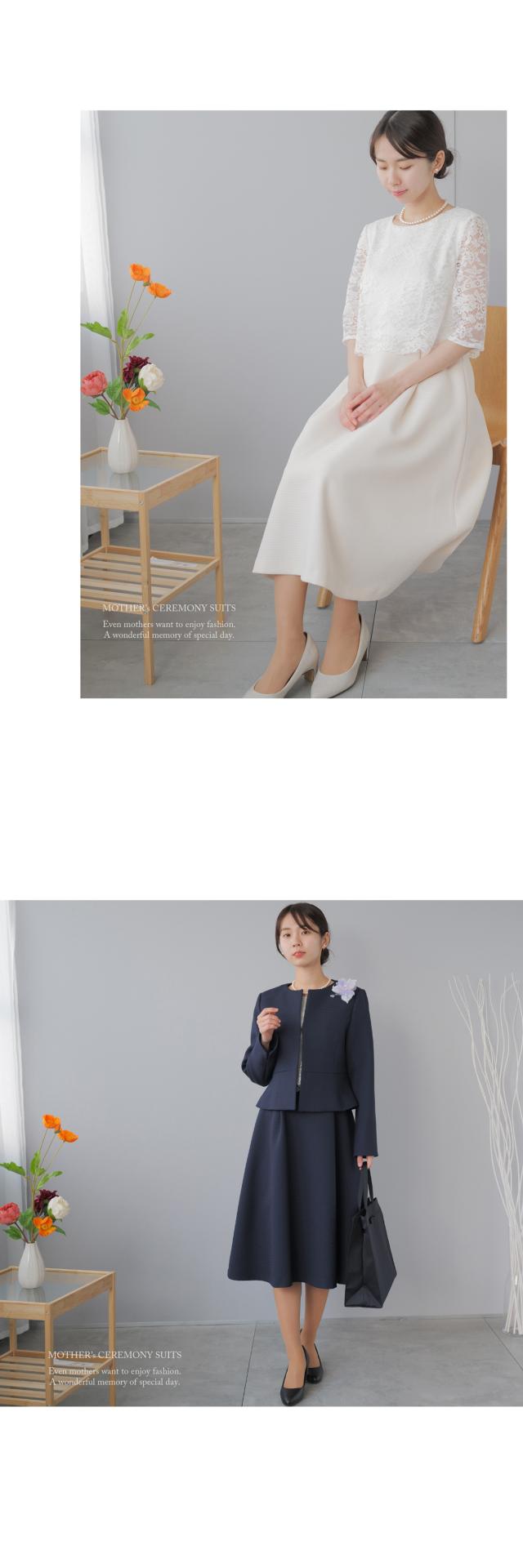 様々なセレモニーシーンを可愛らしく上品に。レースをあしらったふんわり広がるAラインフレアワンピースとペプラムデザインジャケットのセットスーツ。パターンナーのこだわり抜いたドレーピングから生まれたパターンによって作られたジャケット。立体的なラインを作り出してくれるので着心地が良く、様々な体型の方に綺麗にフィットします。