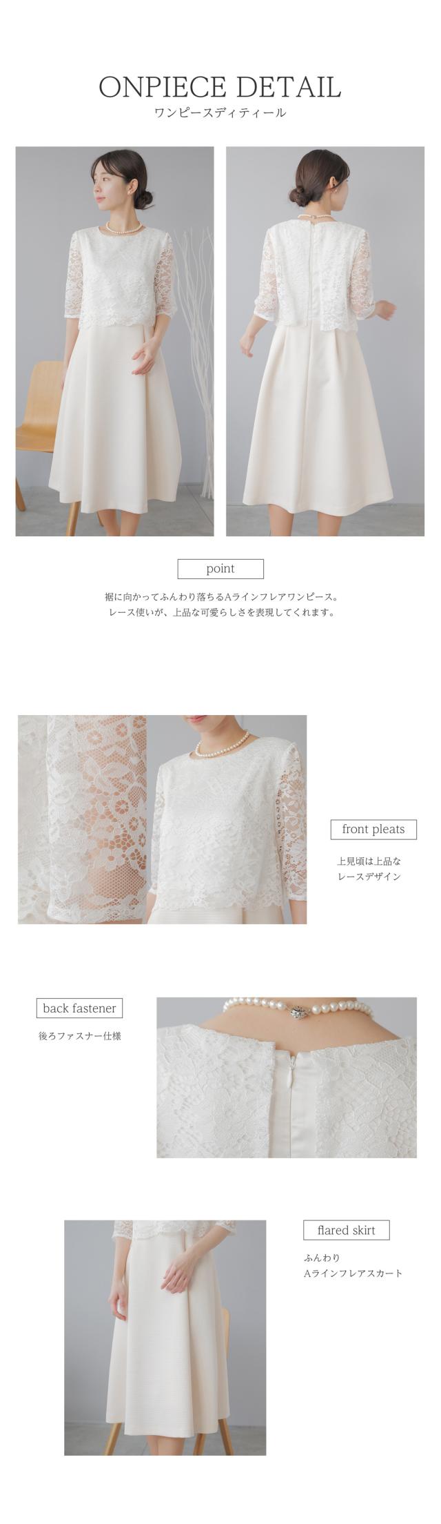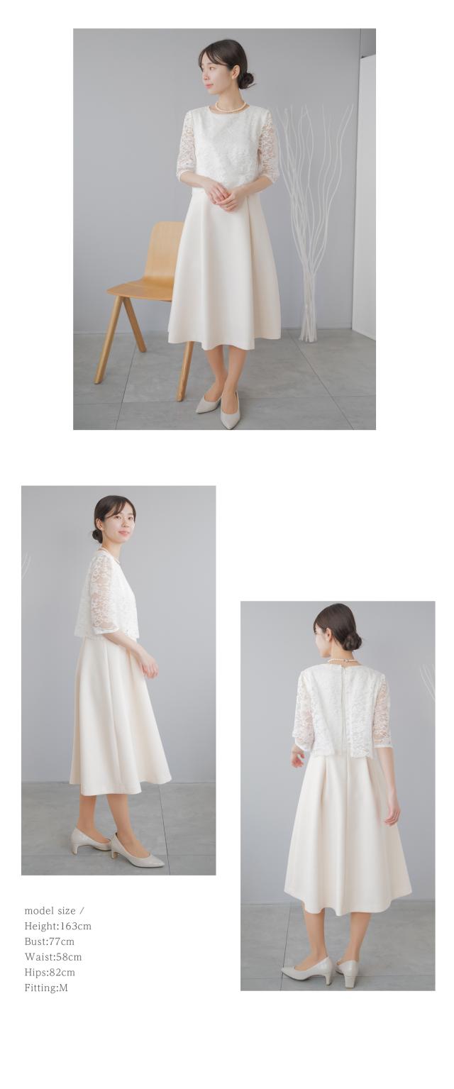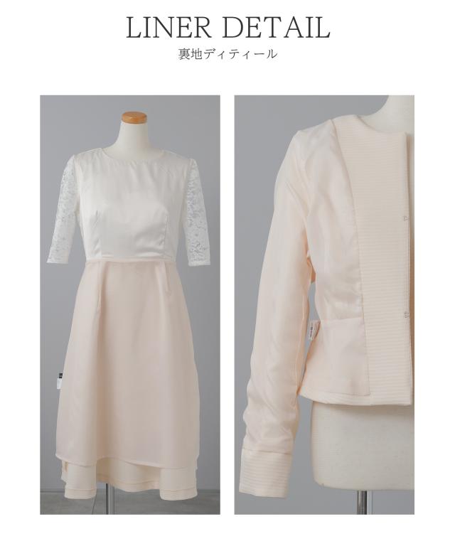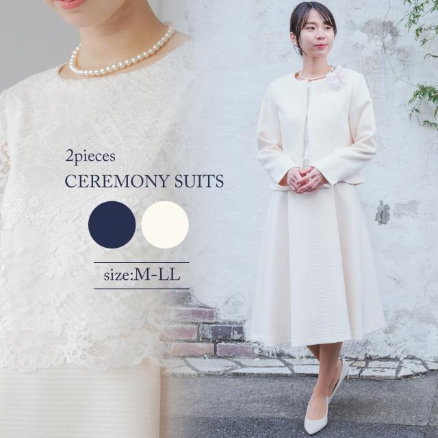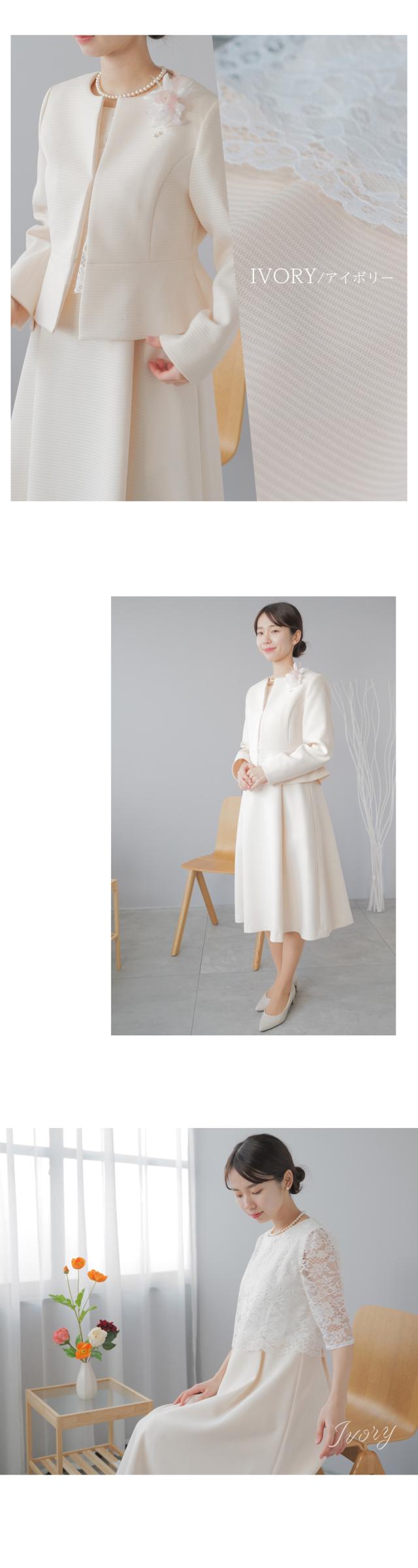 様々なセレモニーシーンを可愛らしく上品に。レースをあしらったふんわり広がるAラインフレアワンピースとペプラムデザインジャケットのセットスーツ。パターンナーのこだわり抜いたドレーピングから生まれたパターンによって作られたジャケット。立体的なラインを作り出してくれるので着心地が良く、様々な体型の方に綺麗にフィットします。