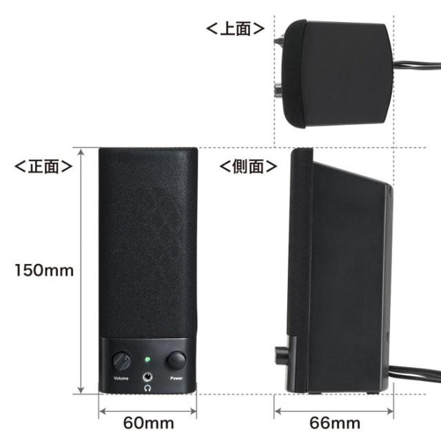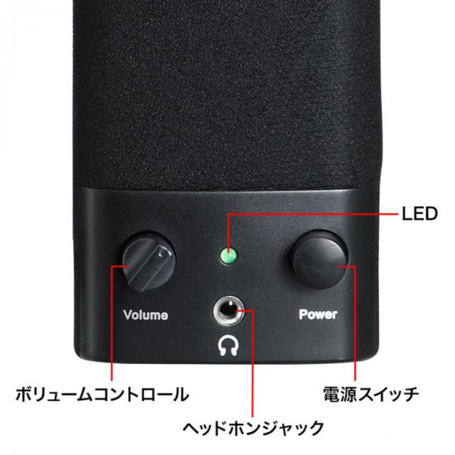 | 仕様 | カラー:ブラック 実用最大出力:1W(0.5W+0.5W) 周波数特性:200〜20000Hz スピーカー形式:バスレフ型フルレンジスピーカーシステム スピーカーサイズ:2×3.5インチ(直径50×88mm) ロードインピーダンス:4Ω 入力端子:ステレオミニプラグ(3.5mm) 外部出力:ヘッドホン端子 電源:内蔵※USBポートより供給(DC5V/500mA) |