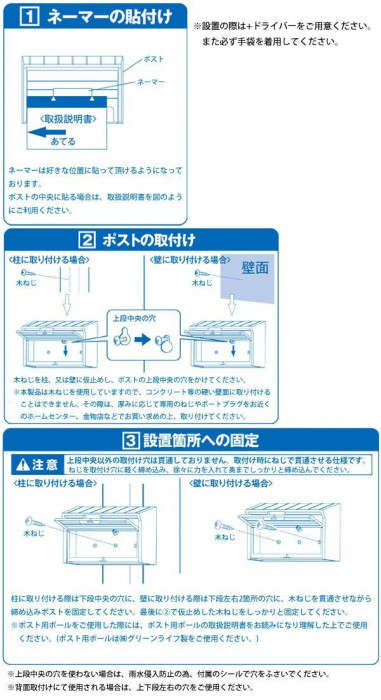 商品詳細:スタンダードなデザインでどんな家にもマッチする日本製ポスト。幅が広くA4サイズの封筒がらくらく入ります。南京錠の取付も可能です。(※南京錠は付属しません。) 生産国:日本 素材・材質:本体:ポリプロピレン確認窓:プラスチック 商品サイズ:約W39×D18.8(16)×H26(22)cm 重量:約1.1kg 仕様:投入口寸法:約W35×H4.3cm投函可能サイズ:A4まで南京錠取付可(取付穴内径:約Φ7mm) 付属品:木ネジ×3ネーマー×1シール×1