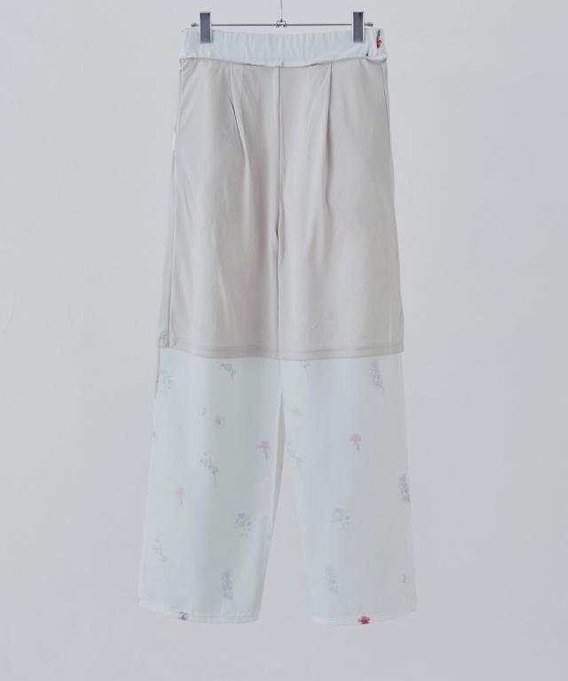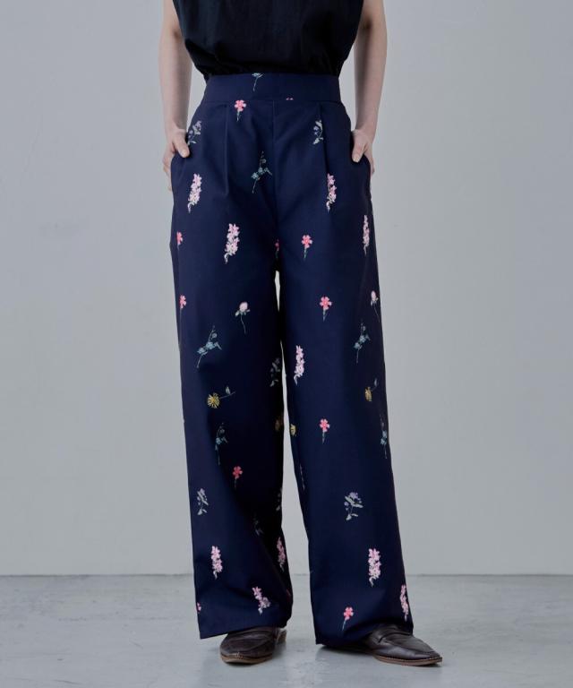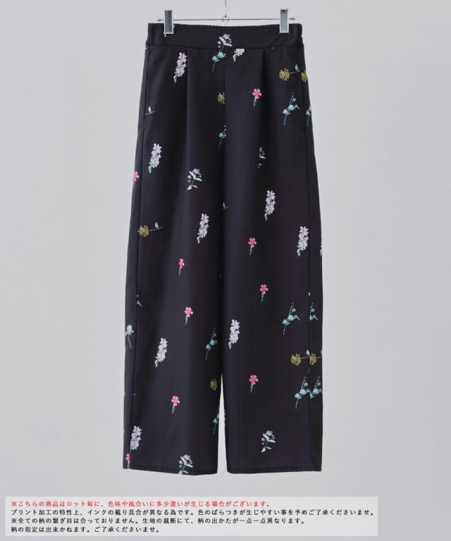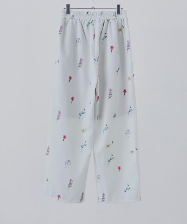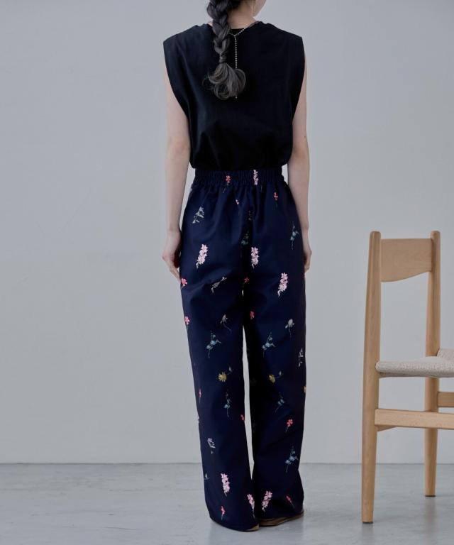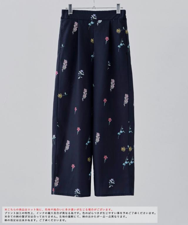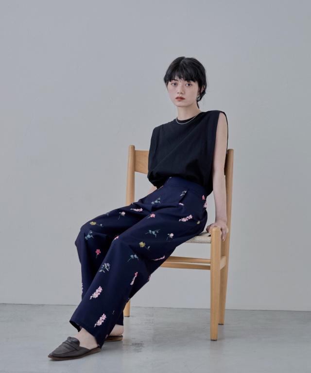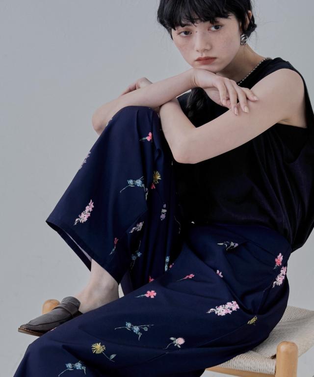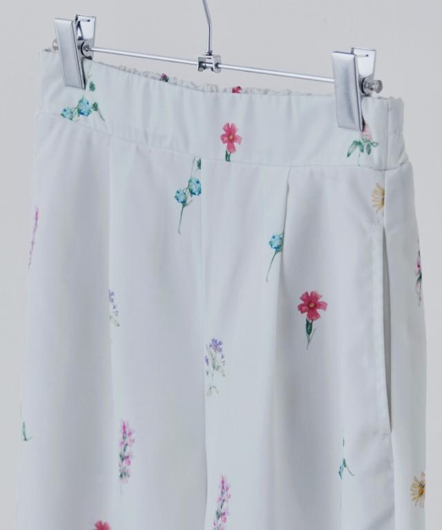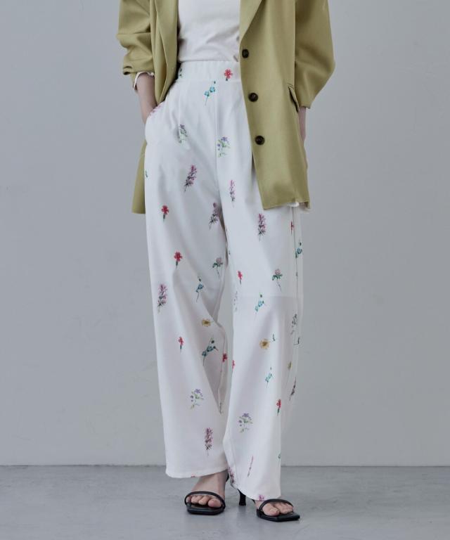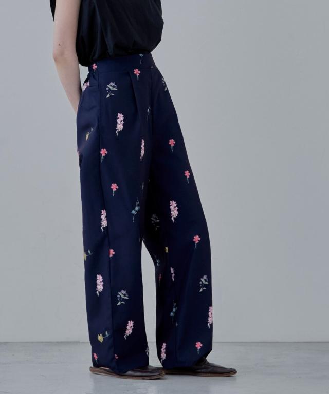 前面に施したタックでウエストはすっきりとしながらも、ワイドシルエットで腰回りのボリューム感をカバーしてくれる花柄パンツの登場です。