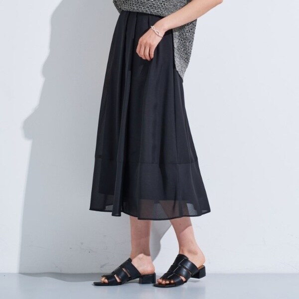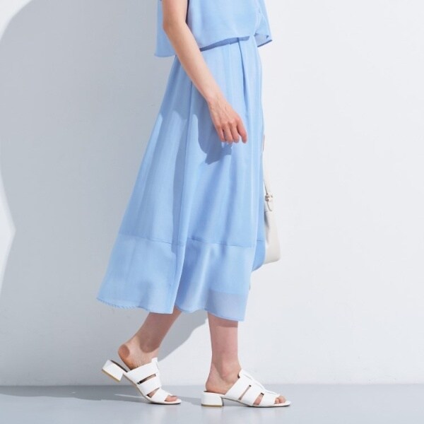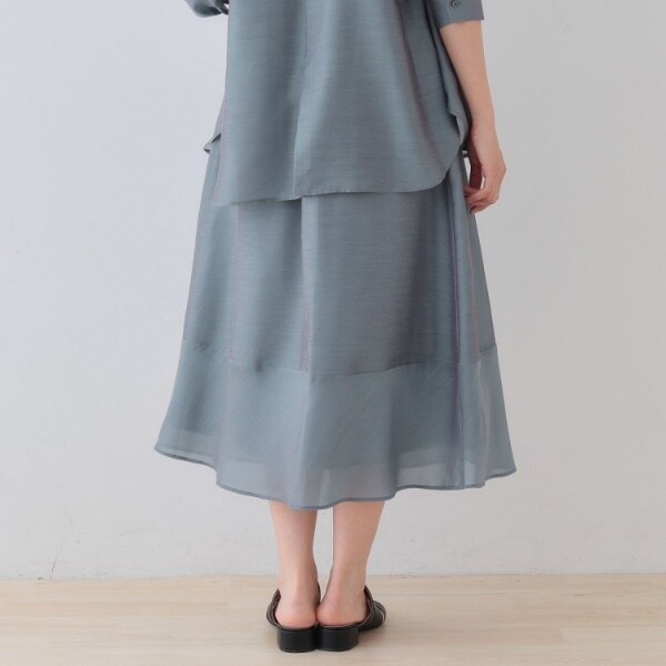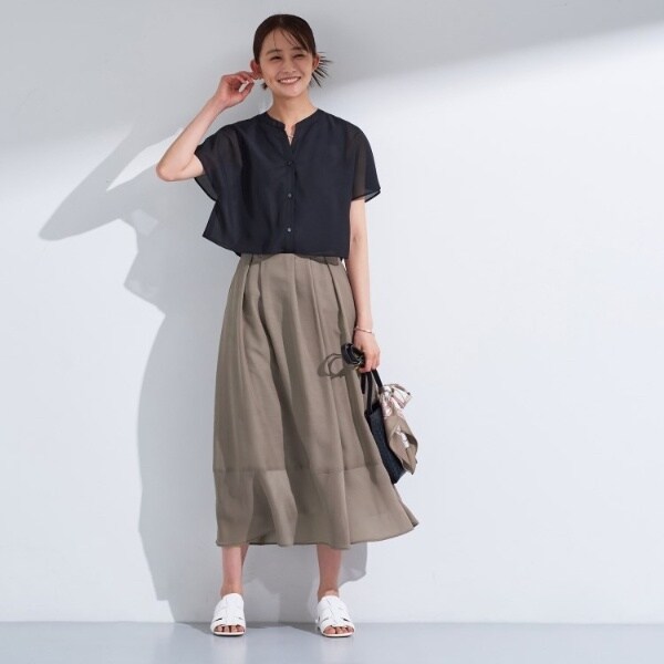 同素材ブラウスのティアード部分のみタックインしていただくと、華やかなワンピース風スタイルになります。