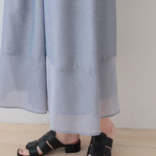 巻き風のデザインで、裾の切り替部分はストライプを斜めに入れてデザインアクセントにしています。