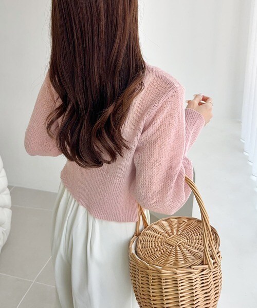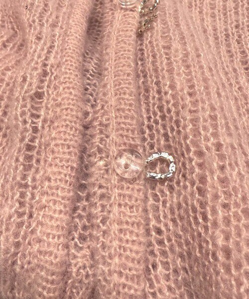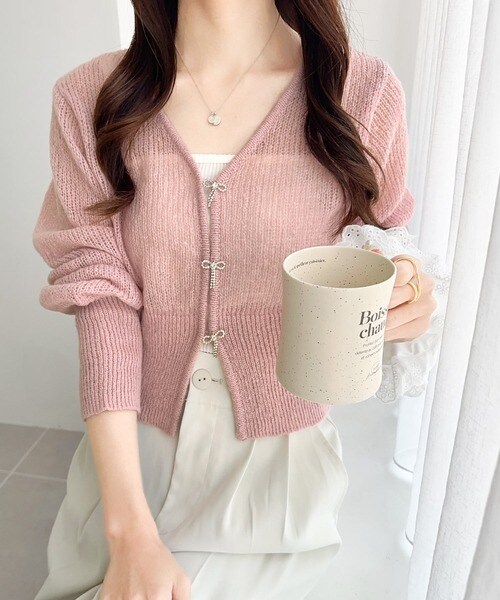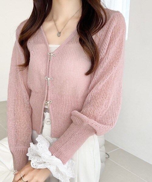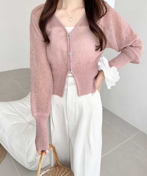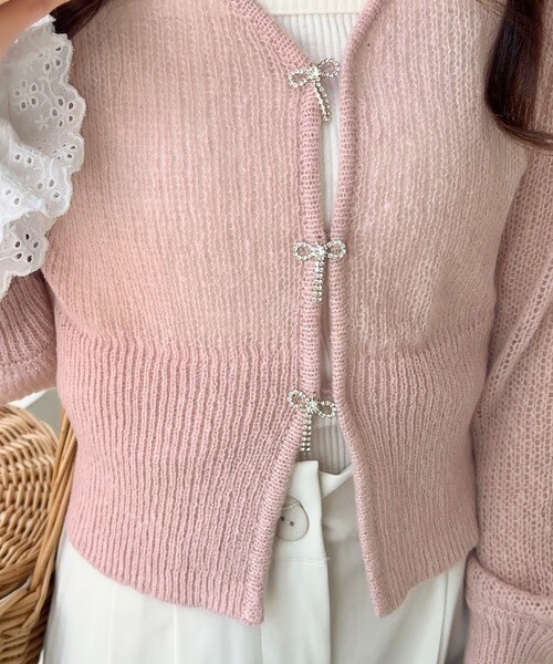 【mily bilet】大人可愛さマックス。透かし編みビジューリボンボタンニットカーデ(ショート丈)